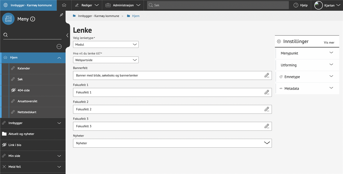 For å redigere fokusfeltene må du klikke på "hjem" i navigasjonsstrukturen til venstre.